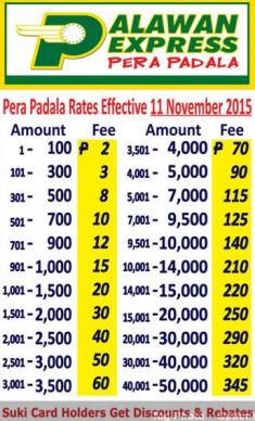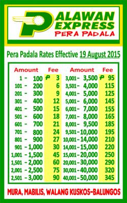 Palawan Pawnshop Pera Padala Rates 2016 Posted by: Noob Blogger in Promo Jan 31, 2016 0 10,725 Views Visayas-Mindanao, South Luzon,Masbate, Romblon, and Palawan Metro Manila and North Luzon text FEE amount (ex: FEE 3000) and send to Globe 09175151518, Smart 09209681297, Sun 09328508613. 2016-01-31 +Noob Blogger tweet